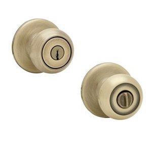 Function:Entry, Free Interior, Finish:Antique Brass Copa Knob SetThe handsomely styled Copa design fits any home, colonial to contemporary. ANSI/BHMA A 156.2 Grade 2 security Classic circular style knob Kwik-Install installation Door Hardware Planning & Measuring Guide