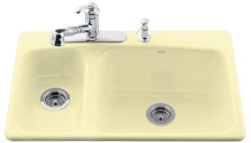 Kohler Lakefield Self-Rimming Kitchen Sink With 3-Hole Faucet DrillingKohler Lakefield Collection33" x 22" Self-Rimming Double (High/Low) Compartment Sink 6" Deep Left Basin and 9-1/2" Deep Right Basin3 Hole Faucet DrillingRecommended Accessories: K-9000 (P-Trap)Available Accessories: K-6507 (Cutting Board-Either Basin), K-2989, K-5917 or K-6636 (Countertop Cutting Board), K-6511 (Wire Rinse Basket-Left Basin), K-6011 (Bottom Basin Rack-Right Basin), K-8801, K-8803 w/ K-8804, K-8816 or K-8817 (Sink Strainer)